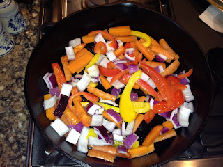 When it is hot (a drop of water will sizzle), turn it down to medium heat and start sautéing your vegetables. Start with the carrots first as they take the longest. Stir and cover in 2-3 minute intervals. You want the carrots to cook, not burn and stay hard. Once the carrots have a pretty good start, add in the onion and the bell peppers. They cook quickly. Keep stirring at this point so the vegetables all cook evenly and don't burn. Once they are done, turn off the burner and remove the pan from the heat. Stir in the spinach or kale, if you are using it. Cover and let it steam until the greens are soft. Uncover and let the sautéed vegetables cool a bit.